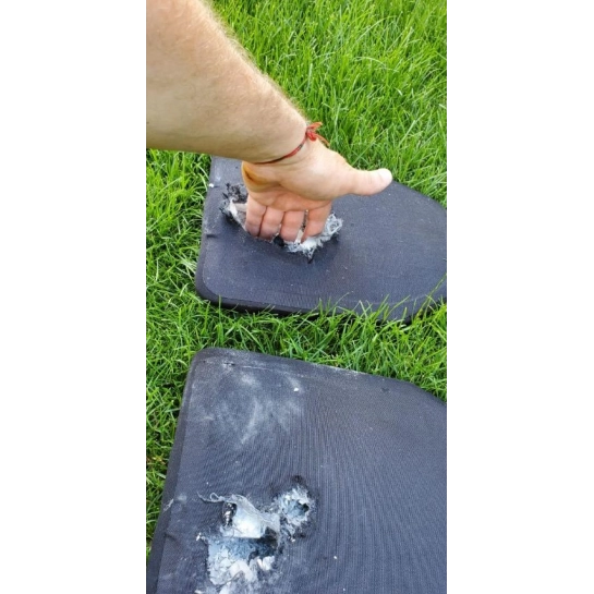 Дякую вам велике, плити супер ! Відстрілював з калаша сімьорки 7.62 , витримали і запреградка ніби в нормі (показав пальцями щоб було наглядніше видно). Ще радує, що кераміка не розлетілась, а знач не посіче.