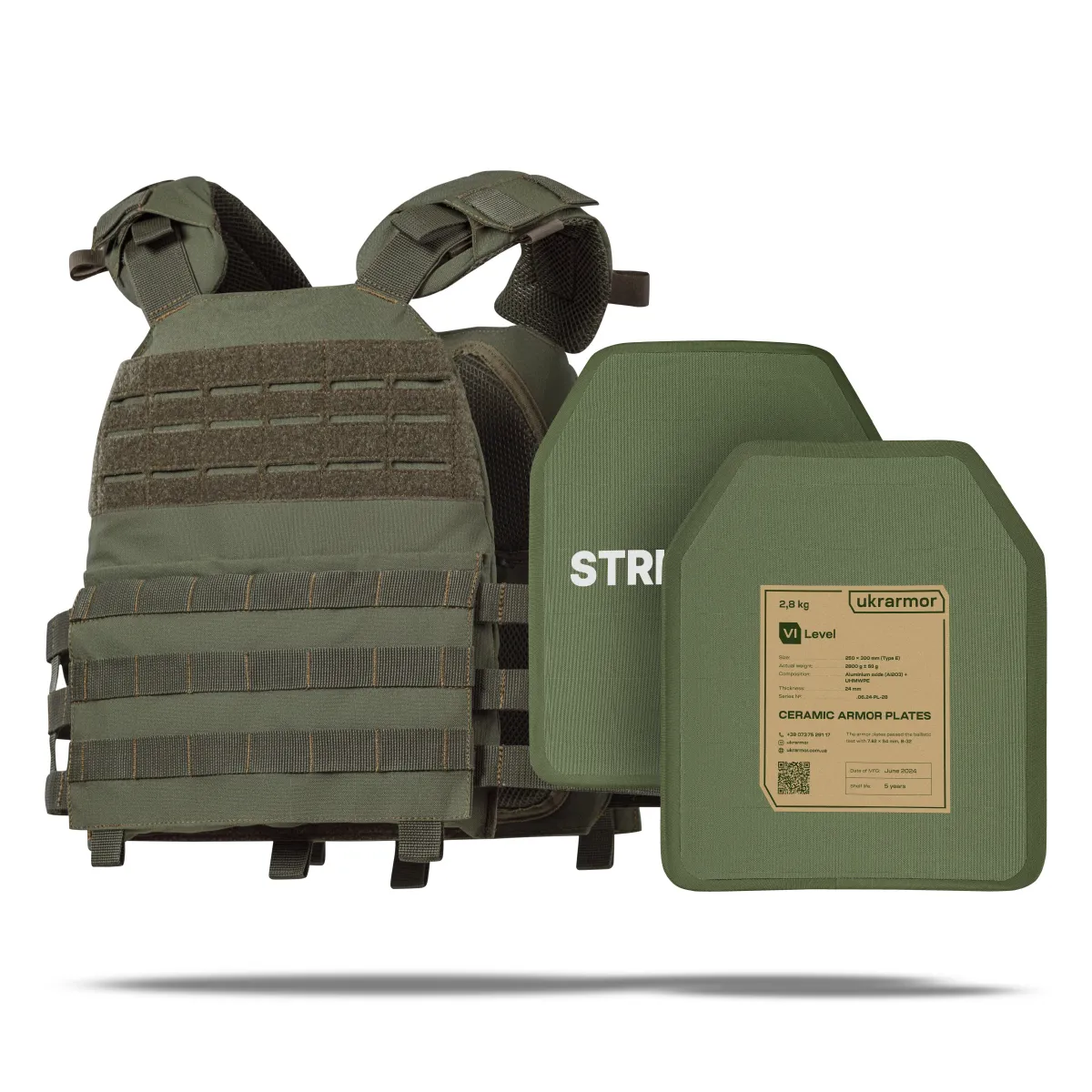 Сверхлегкий и современный бронежилет максимального 6-го класса защиты в состоянии выдержать три попадания пули Б-32 из снайперской винтовки СВД (это все с расстояния 10 м. по стандартам испытаний лабораторий ДСТУ) при весе всего 6.4 кг. (такие свойства обеспечивает керамика и способ ее изготовления). В комплект входит: две керамические бронеплиты 6-го класса защиты (вес каждой 2.8 кг) и наиболее удобную для прицеливания и стрельбы плитоноску Modular Vest Platform из материала CORDURA 1000