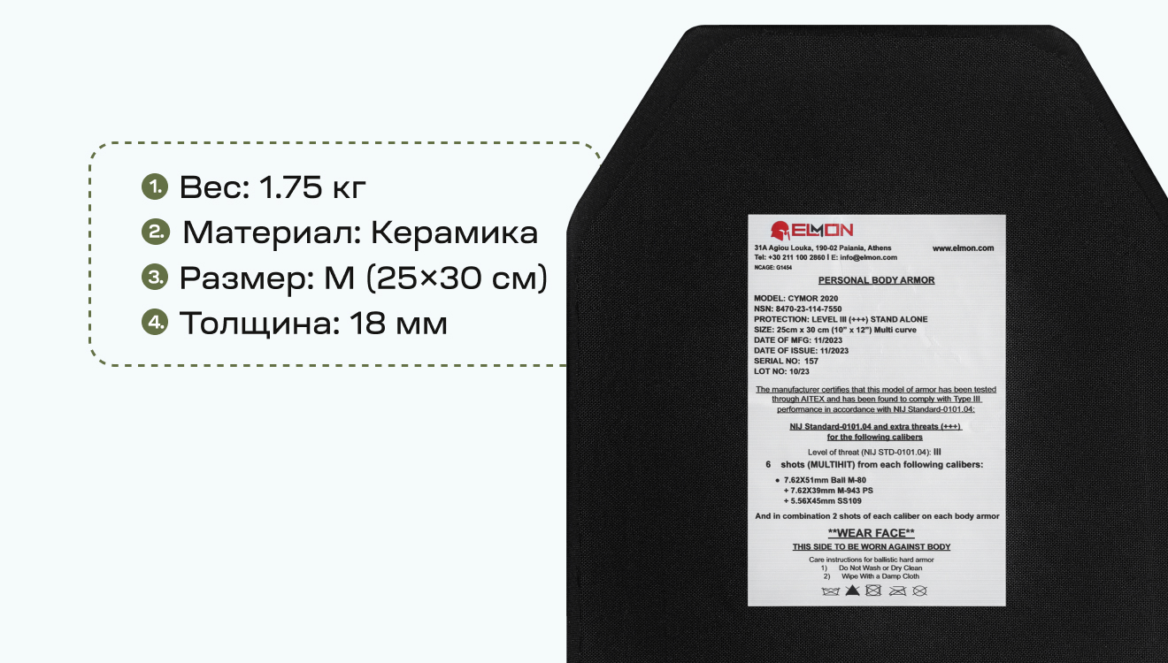 Керамические бронеплиты соответствуют Level III+++ по NIJ Standard-0101.04 (США) и весу всего 1.75 кг. способны выдержать по 6 попаданий пулей: