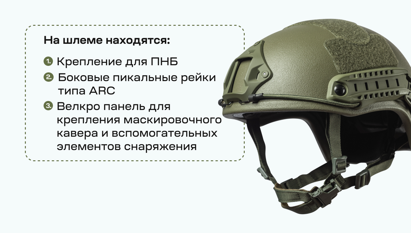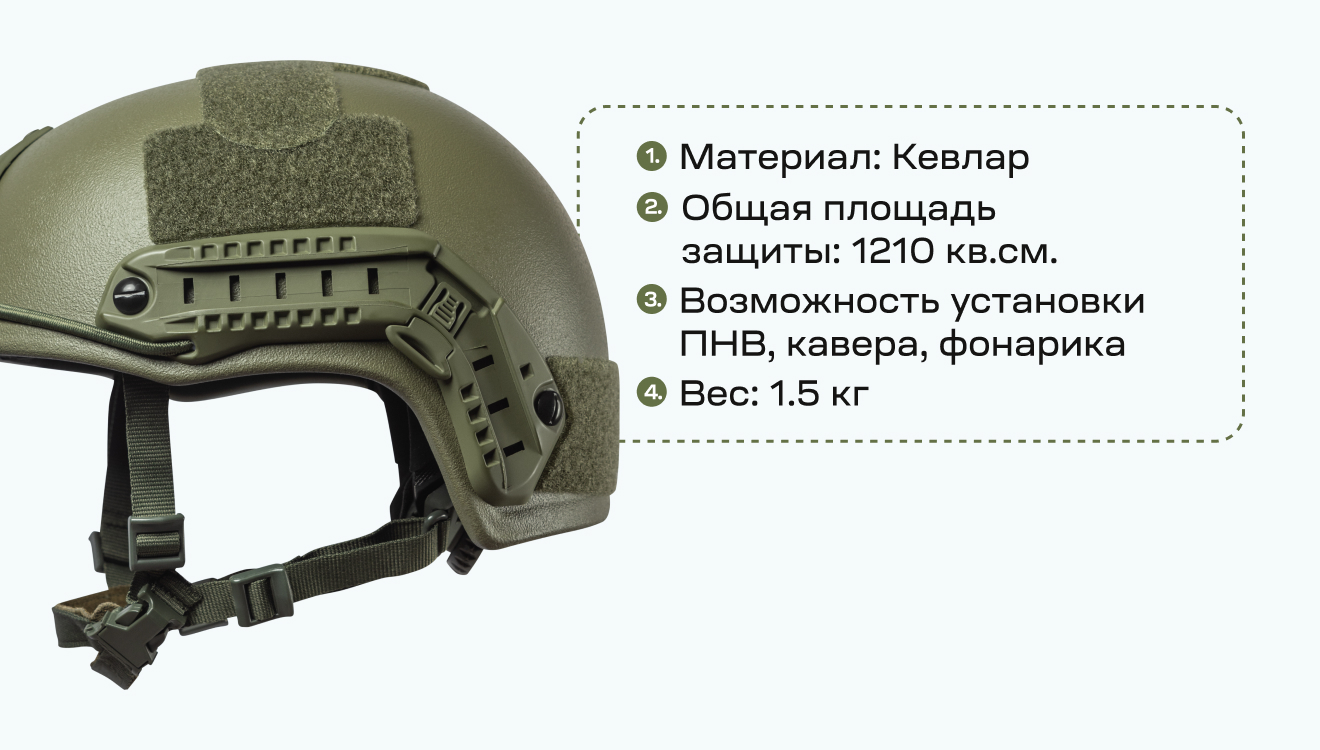 Легкий и надежный кевларовый шлем типа Fast с вырезом под уши и реечным креплением ARC, что позволяет его индивидуально апгрейдить (то есть крепить наушники, фонарики, ПНБ и др. ) под различные тактические задачи для различных типов и родов войск, а уровень защиты NIJ IIIA предохраняет от поражений обломками, рикошетами, выстрелами из легкого стрелкового оружия и вторичных поражающих элементов типа стекла и бетона.