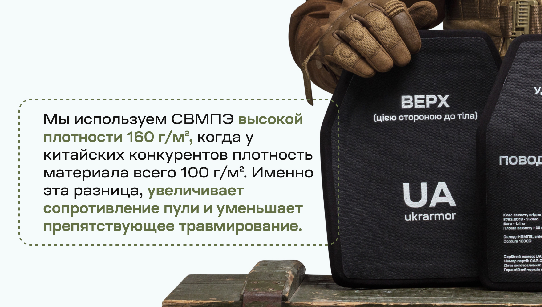 Для справки, почему наши плиты 3 класса защиты лучше и легче китайских. Мы используем СВМПЭ высокой плотности 160 г/м², когда у китайских конкурентов плотность материала всего 100 г/м².
